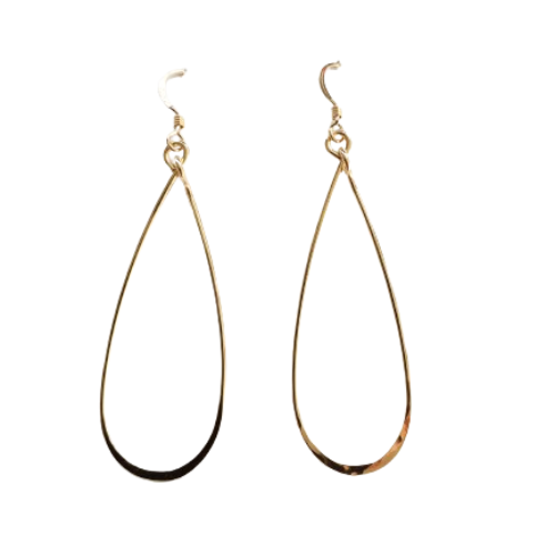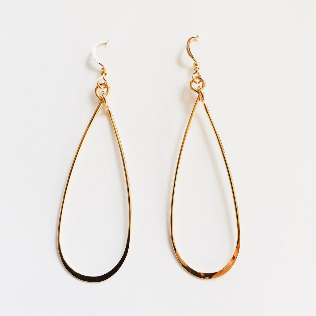 These hoop earrings feature an eye-catching slender teardrop shape with a flattened, light-catching hammered finish along the bottom edge.