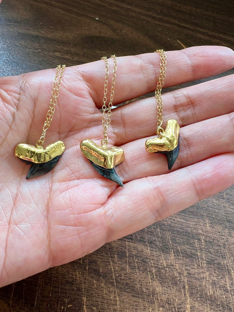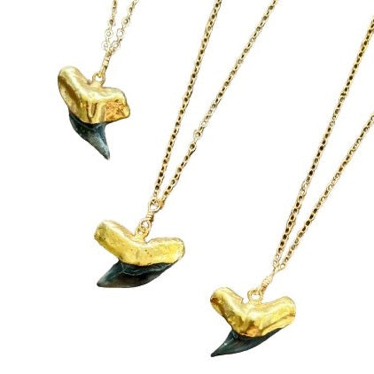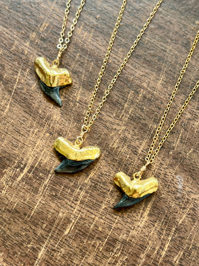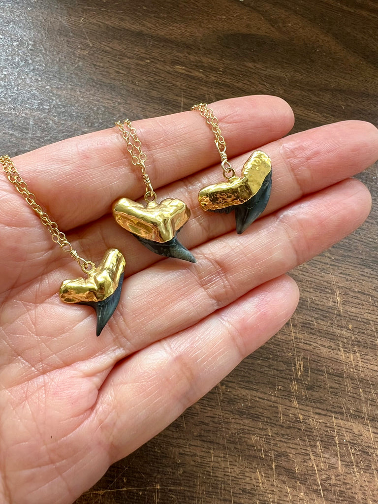 Black shark tooth dipped in 24kt gold dangle from a classic 14k gold-filled cable chain.